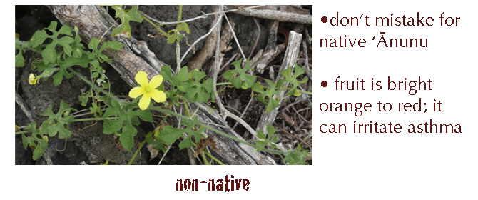 Bitter gourd is removed from the forest as a non-native, though it does have a history of use for food and medicine. Here it competes with the other native plants. Don’t mistake this for ʻĀnunu, as some do at first. If you don’t know for sure, no shame, just ask someone who does. If you have asthma, stay away from this plant—especially its ripe brilliant orange-red fruit.