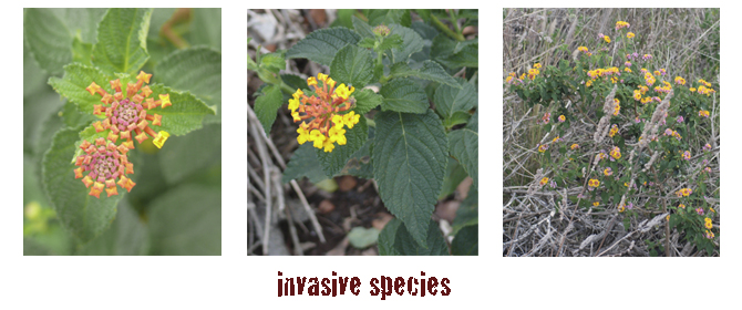 Lantana is a thorny, invasive bush that volunteers pull only when it is a young plant before the thorns grow large. It is always done wearing gloves, with hands right at the ground to pull out roots and all. When as large as the bush shown on the right, more is required for its removal. The flowers have a distinctive strong smell.